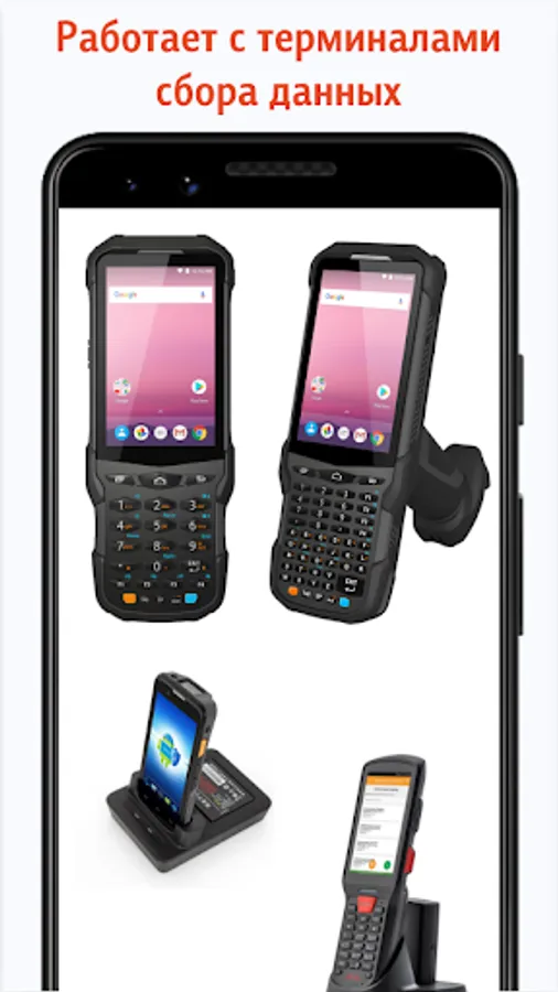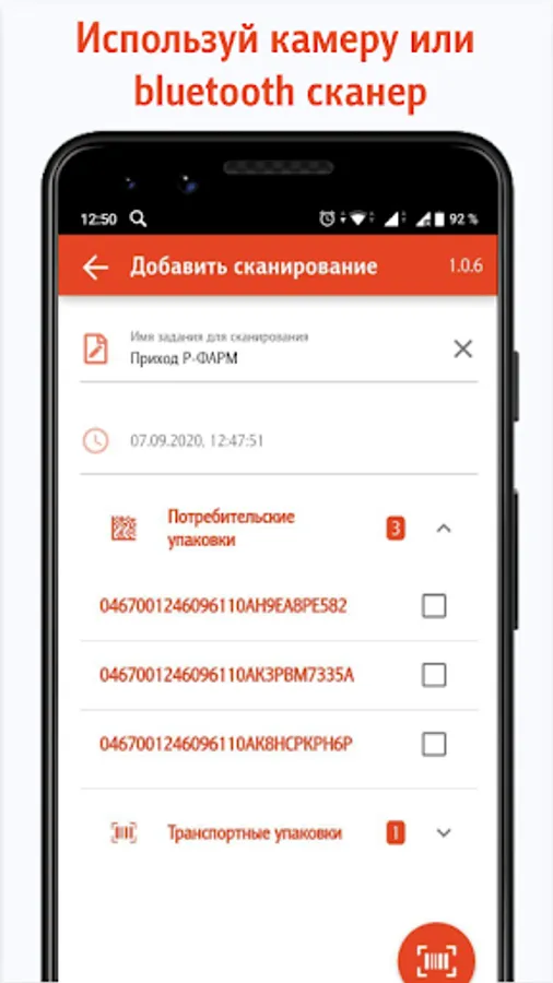 Scanning is carried out by the built-in camera or by a barcode scanner connected via the Bluetooth interface.