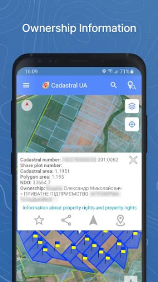 - visually locate the land on the cadastral map and get click information on the cadastral number, land area, type of property and purpose. When completing additional authorization on the website of the State Geo Cadastre of Ukraine with the help of an electronic signature, obtain information on ownership and property rights;