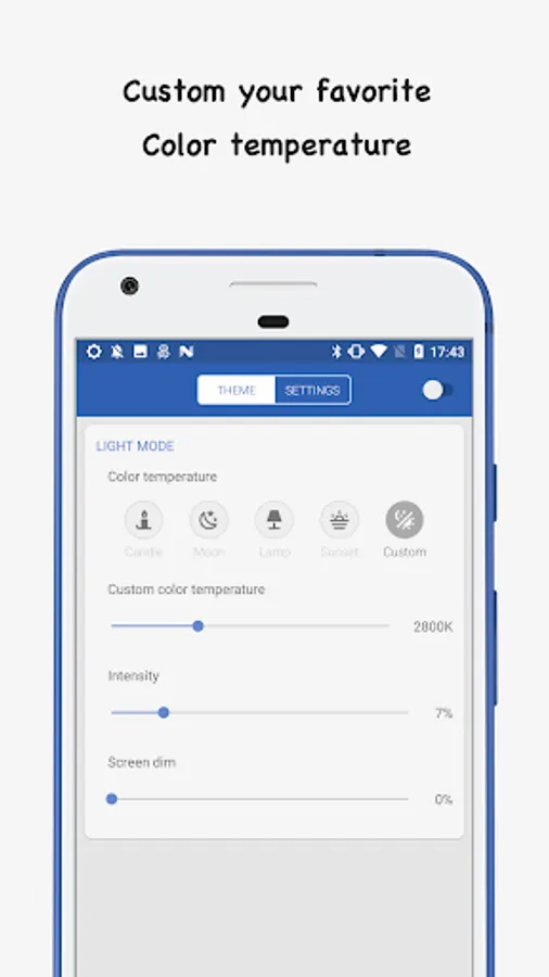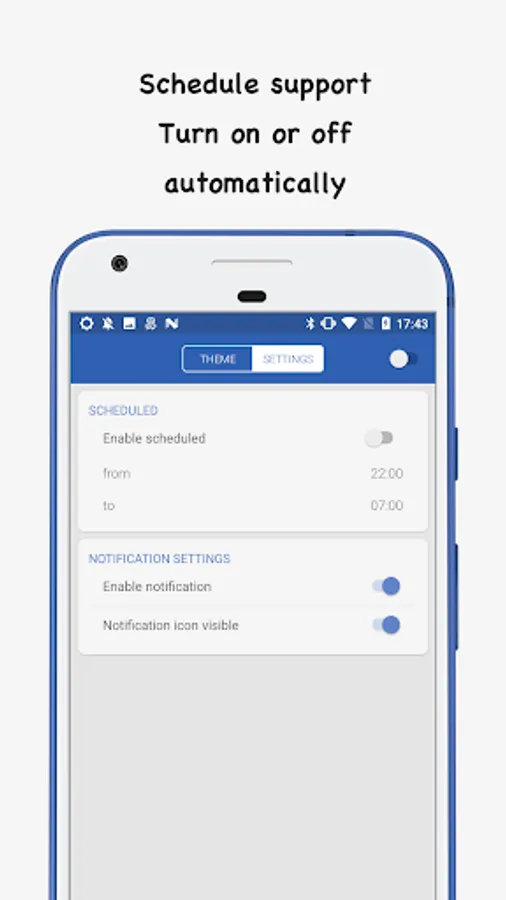 With a alarm, Blue Light Filter app can turn on at night and turn off at morning or any time you like.