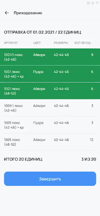 The section "Revision" is a table of the actual availability of stock balances by model, color and size range, which allows you to timely place orders for the most demanded models.