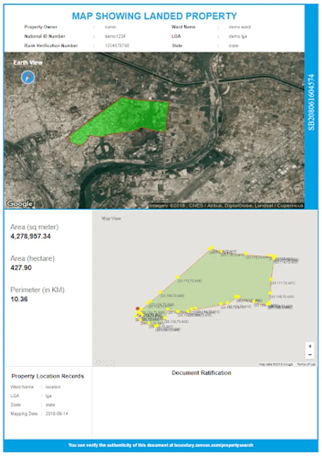 If you download Zenvus Boundary app on Google Play, follow the screen instruction (register, login, etc. Please note the NIN as you need it to access the survey later). Click BEGIN PROPERTY to enter scan mode, put the property info, and click CAPTURE as you walk around the property perimeter. When you are back to the original position, click EXIT PROPERTY. That completes the data acquisition. Once that is done, click the SERVER TRANSFER mode when you have internet on the mobile device. If you are an individual property owner, put 0000 on the field code (agents/partners/enterprises, capturing many farmers at once, use the code we sent you). When transfer is done, it will say “…successful”. (Our algorithm will construct the survey with the data, superimposing on Google Map to deliver a survey which puts your property in visual relationship with other properties around.) Copy this link to your web browser https://boundary.zenvus.com/ ; your log Id and password are both the NIN you used for this property in the mobile app. System will ask you to create password and email. Inside you will see your survey to view and print. For Agents, the process is different as you would have access to all properties under your control, read the manuals.