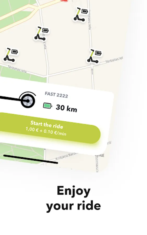 - When you are close to the scooter, tap on the scooter icon on the map and then on “Start the ride”, or scan the QR code and tap on “Start the ride”.