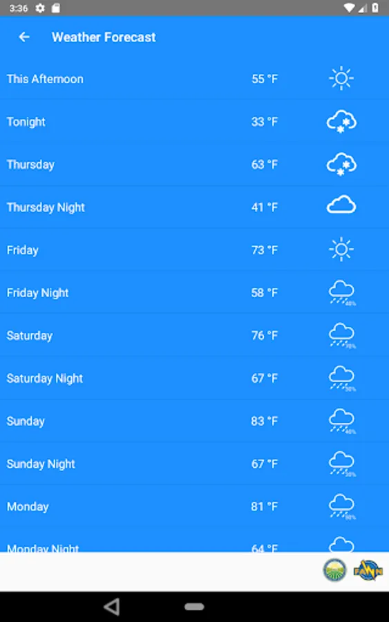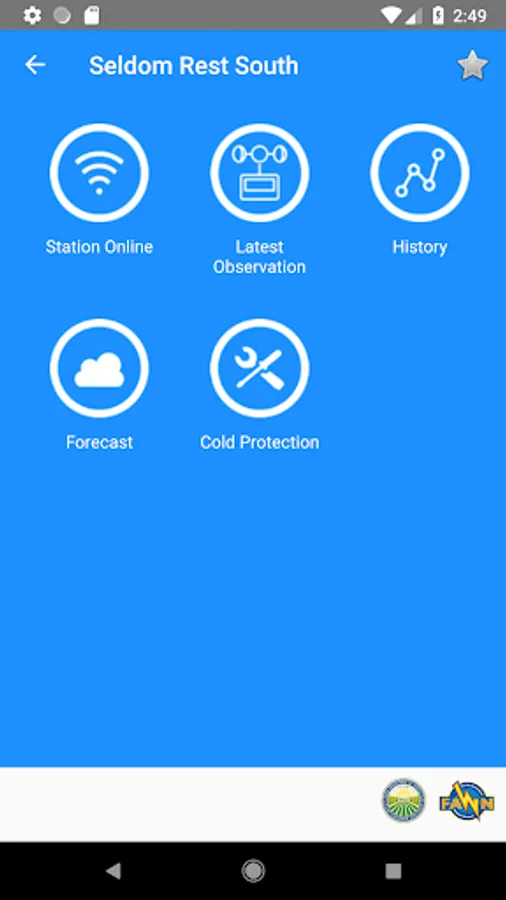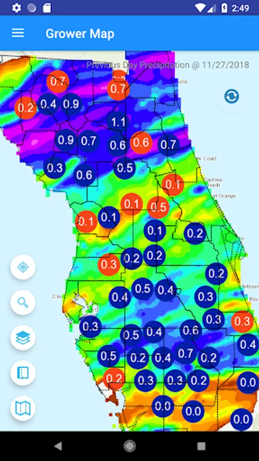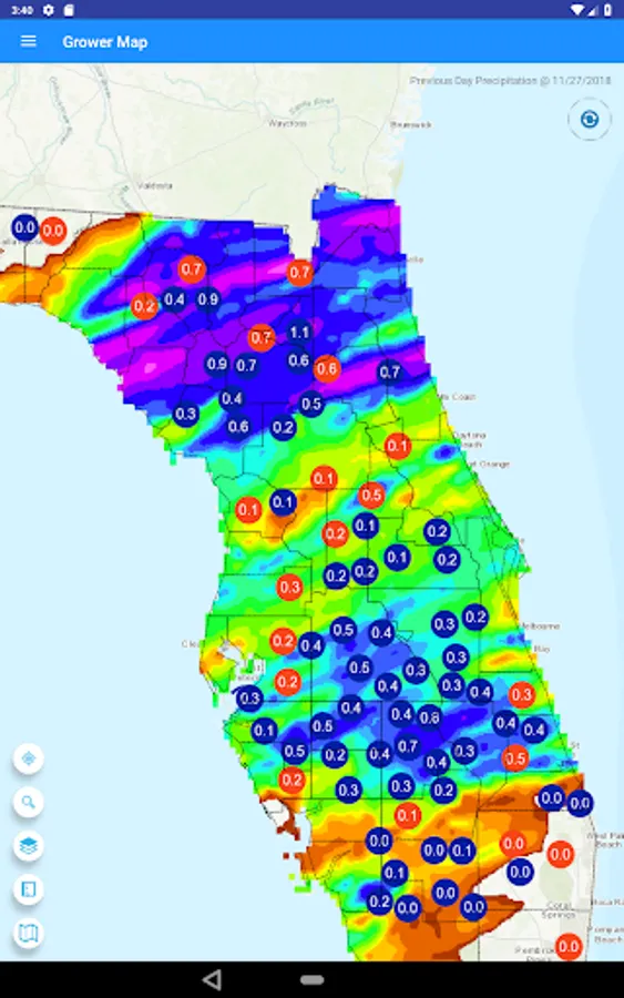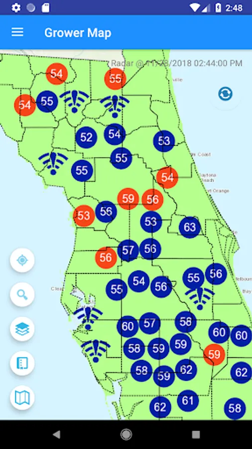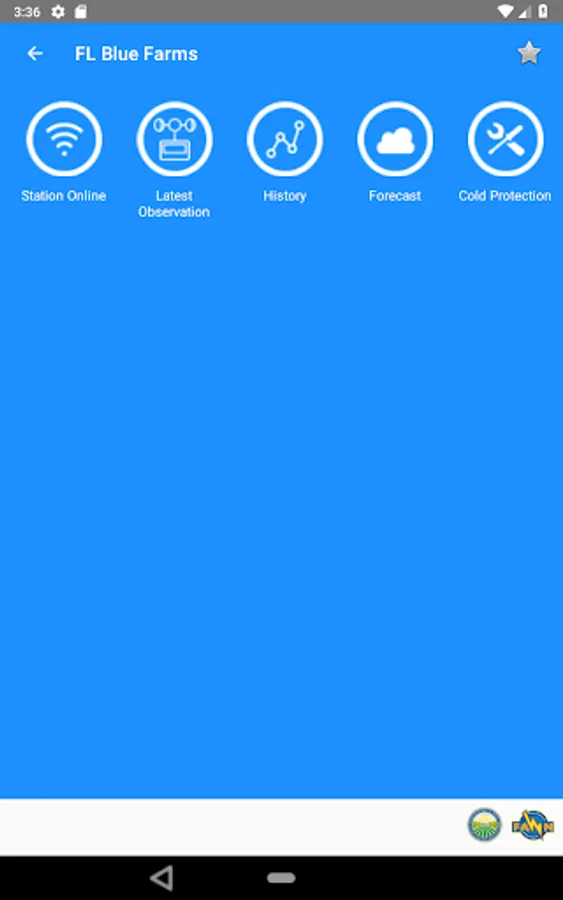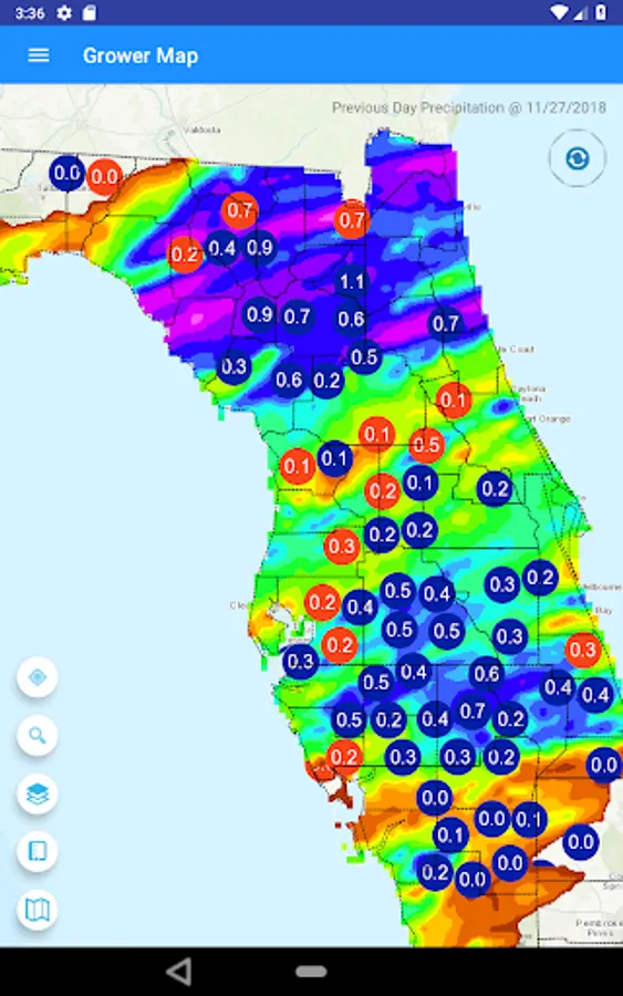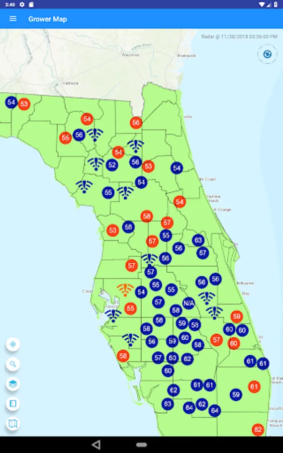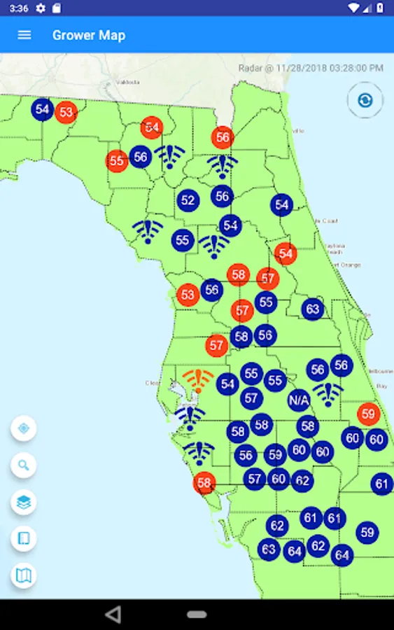 View weather conditions at farm-based stations in Florida using with the My Florida Farm Weather (MFFW) Android app. Navigate to participating stations on a zoomable map, then view all current measurements for that station, a forecast, freeze protection decision-making tools, and even receive minimum temperature notifications. You can also upload a temperature from a handheld thermometer that will display on the map, save a Favorites list, and turn on and off various map features.
