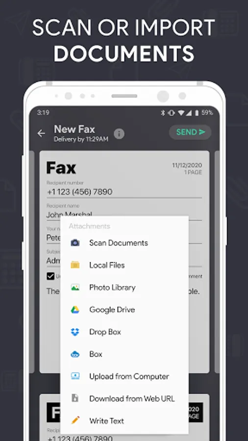 ● Send & Receive Faxes - Easy faxing procedure with Fax app. Upload files easily from your phone, email or cloud storage to efax images, fax photo, fax documents & you can fax from phone free for 7 days. Get a fax number to receive fax online through this genius tiny e fax machine. Send fax free to any fax number.