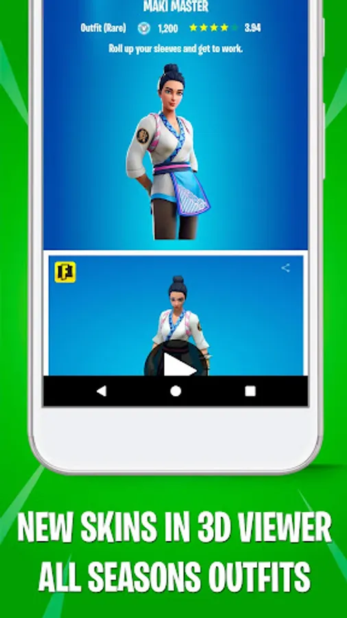 Detailed information sheet with their respective skin in 3D, name, description, picture in high quatility, rarity, Price in V Bucks and ratings of players.