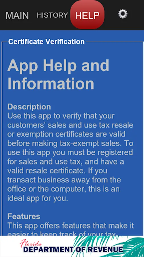 Use this app to verify that your customers’ sales and use tax resale or exemption certificates are valid before making tax-exempt sales. To use this app you must be registered to collect Florida sales and use tax, and have a valid resale certificate. If you transact business away from the office or the computer, this is an ideal app for you.