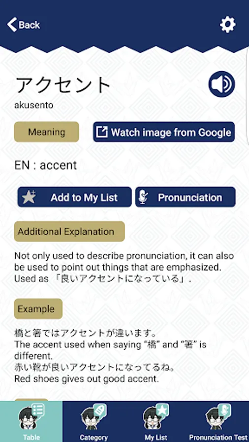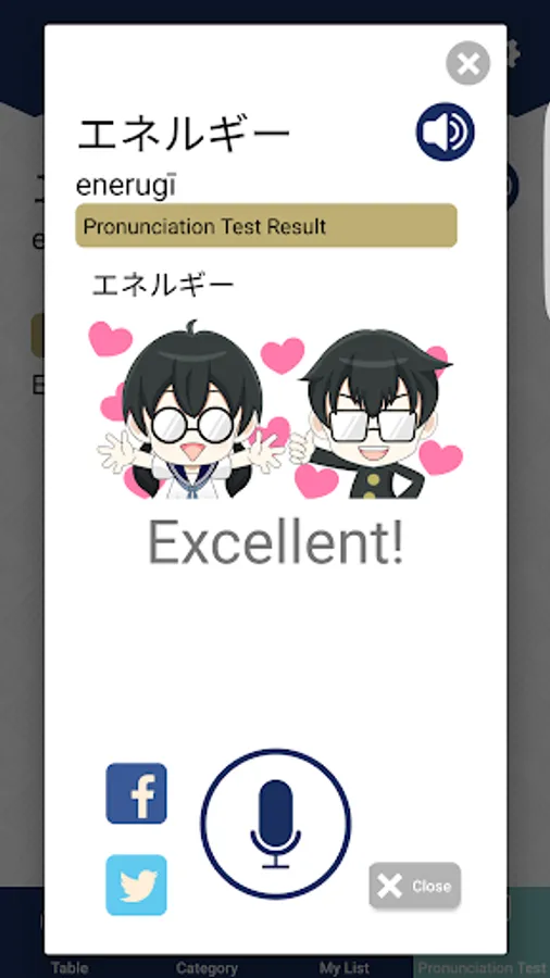 - Pronunciation audio can be chosen from the voice of a girl, or the voice of a boy. You can listen to the pronunciation from the voice of each cute character. Unlike mechanical voices, it is fun to listen to!
