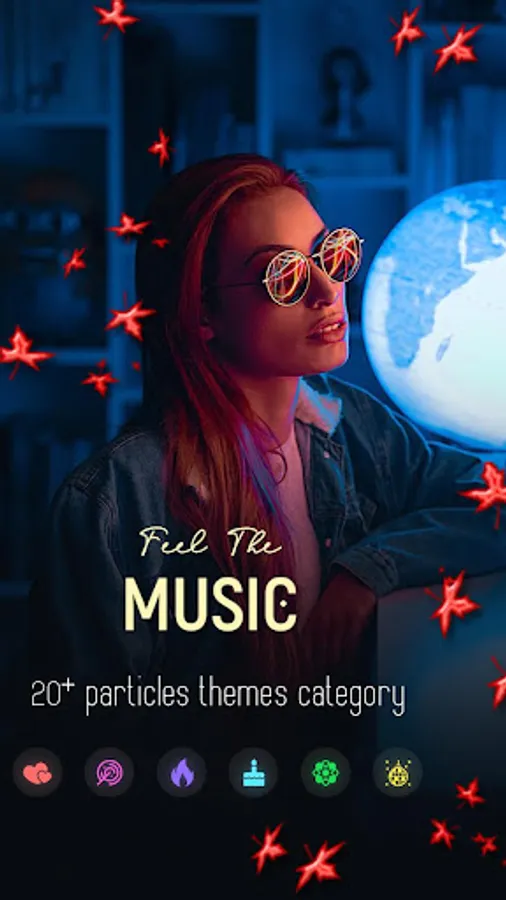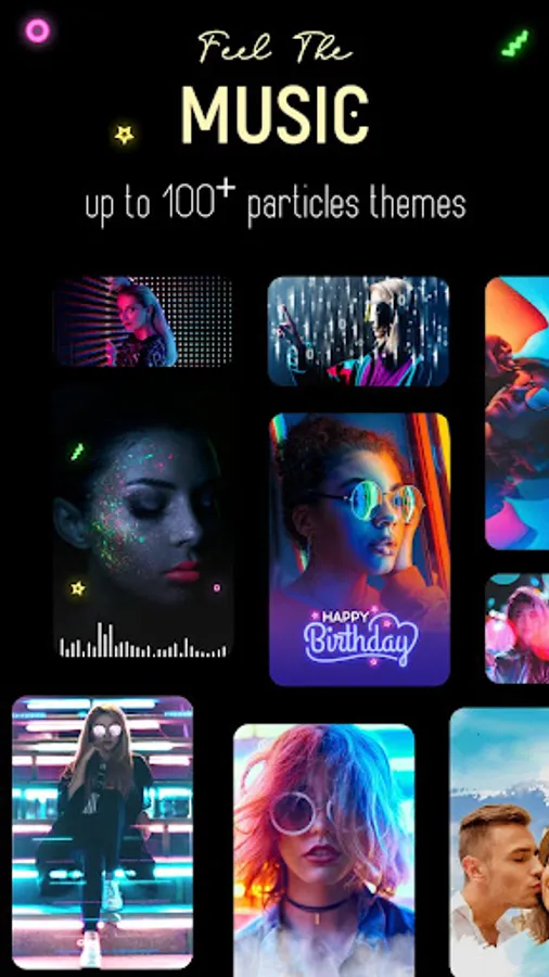 You can easily create your video many beautiful and attractive animated particle.ly effects on Feel The Music : Music Bit Video Maker.