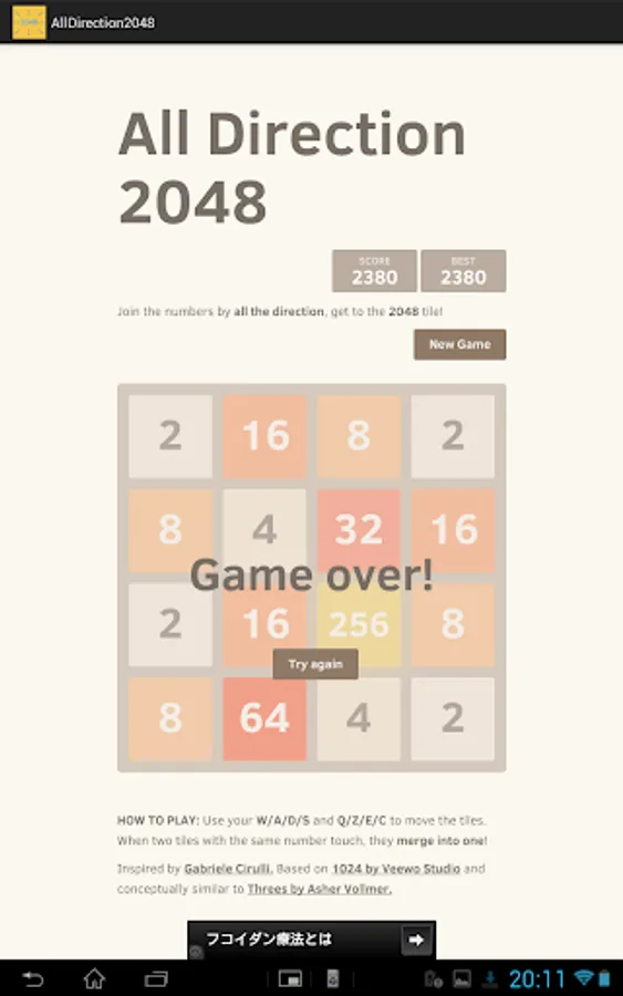 Inspired by Gabriele Cirulli(http://gabrielecirulli.com).