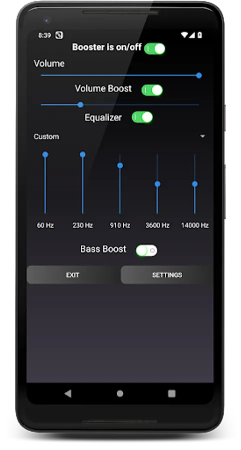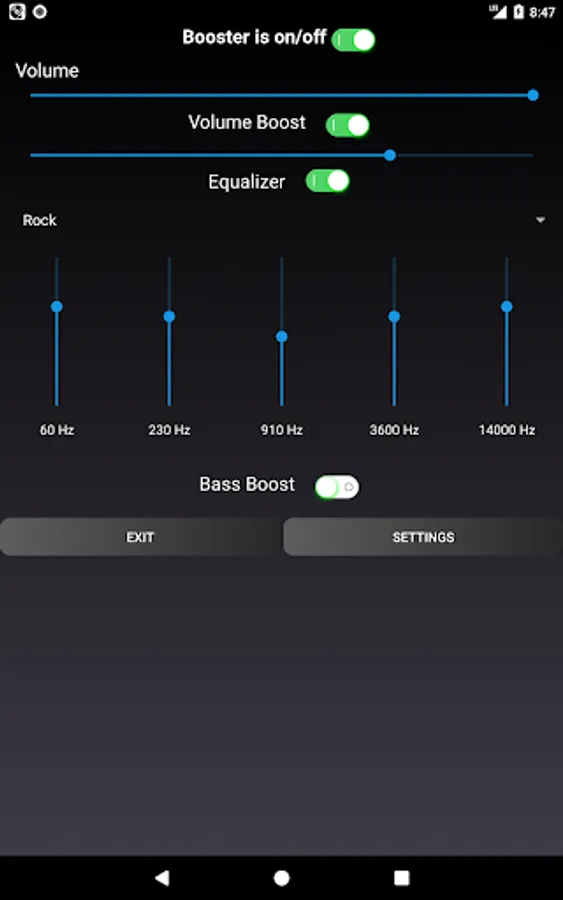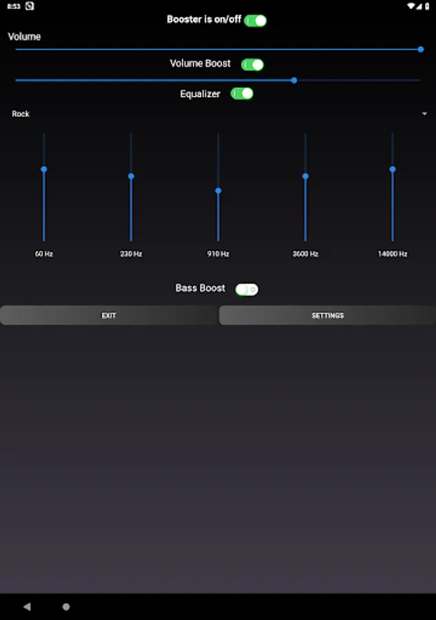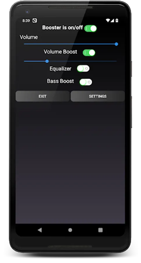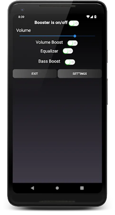 Music application for Android “Volume Booster, Equalizer and Bass Boost for Music” has four main features: volume, equalizer, volume boost and bass boost.