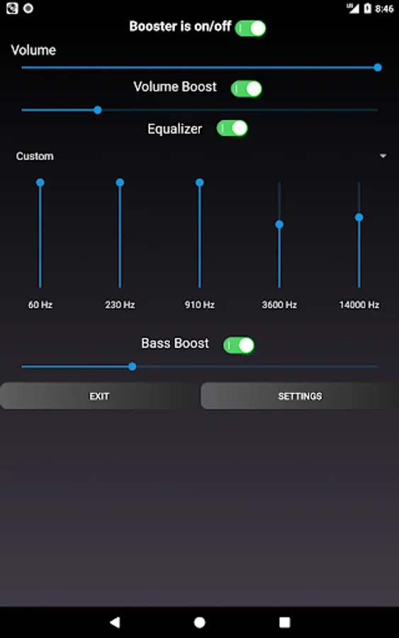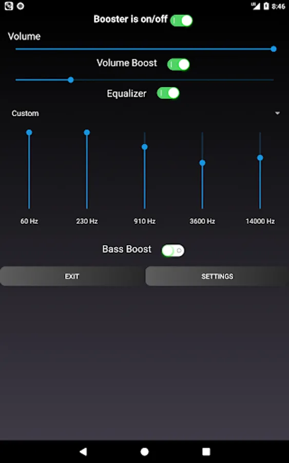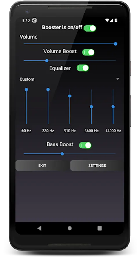 Bass booster in the volume controller “Volume Booster, Equalizer and Bass Boost for Music” makes the low frequencies louder without using equalizer.