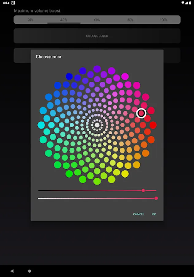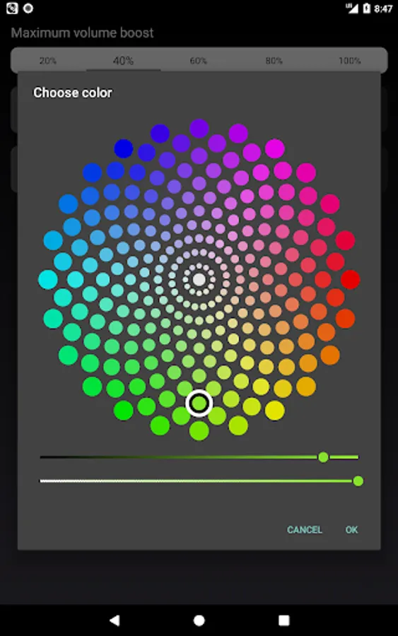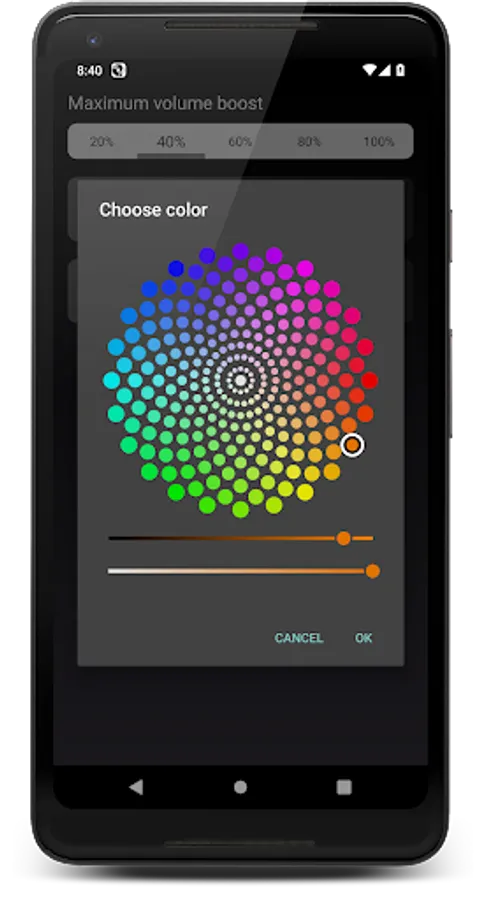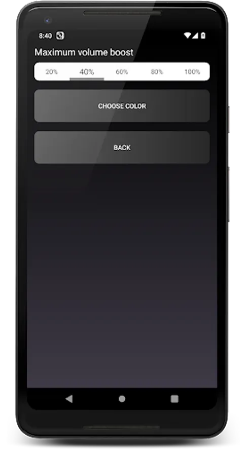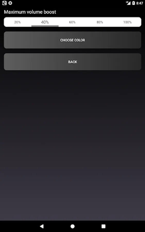 You can choose the maximum volume boost in the settings of the app “Volume Booster, Equalizer and Bass Boost for Music”: 20%, 40%, 60%, 80%, 100%.