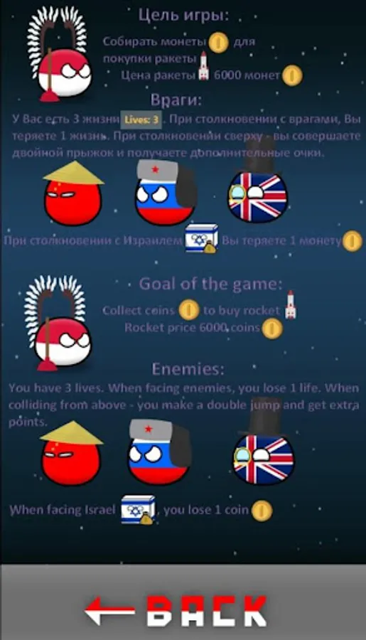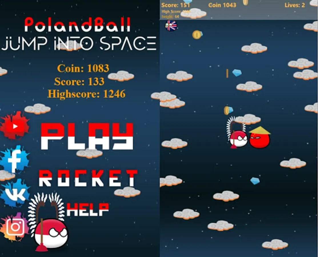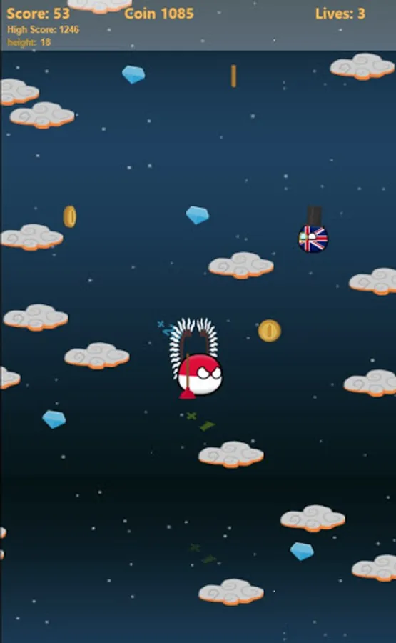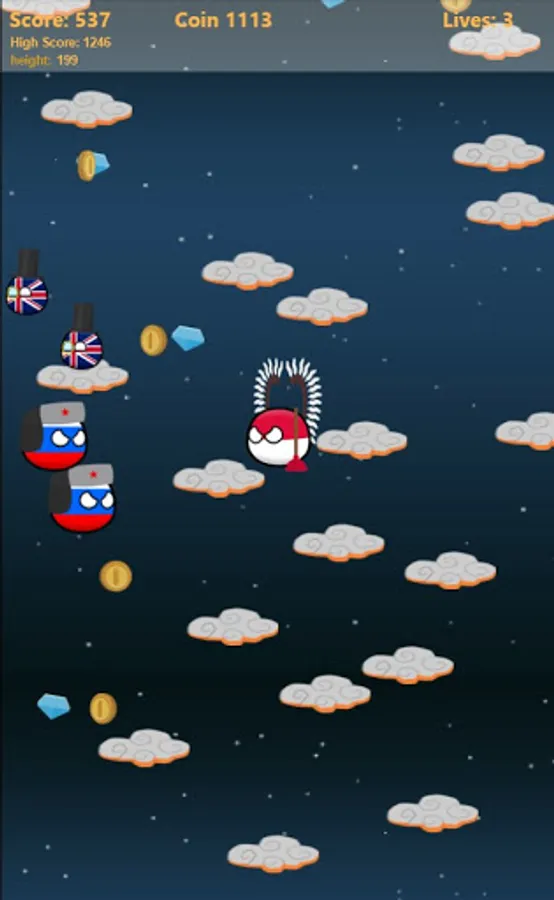 This is a game in which you need to jump over the clouds and collect coins to buy a rocket. Not so easy! Other countries will interfere with you.