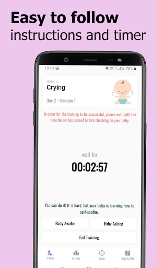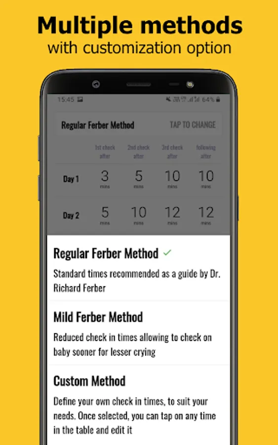 The very simple and intuitive app, will help you with the tips and tricks, preparation and FAQs you need to be aware of. The app also allows you to choose a milder method, which allows you to check in earlier than the times recommended by Dr. Ferber, as well as making up your own times.