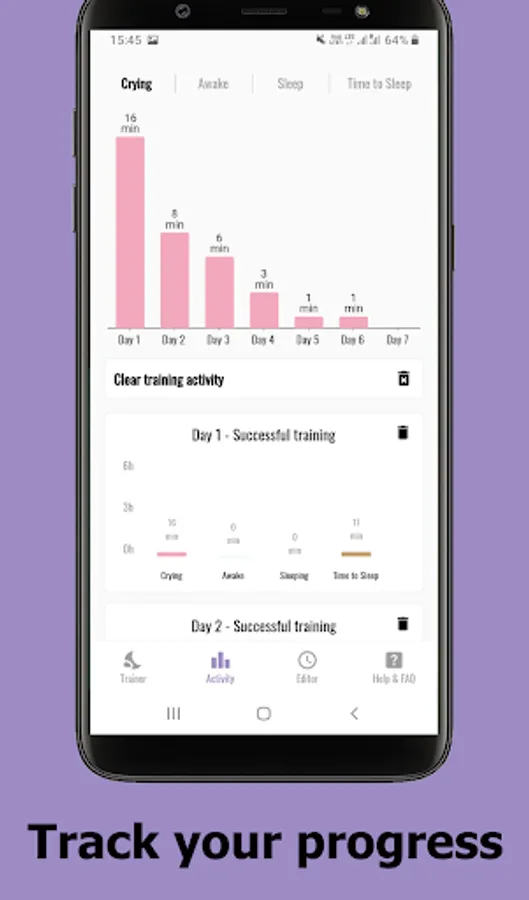 The graphs show you the progress of the method, specially you will notice how crying time and time to sleep is reducing for your baby as you use the app.