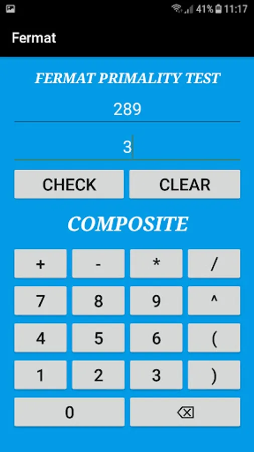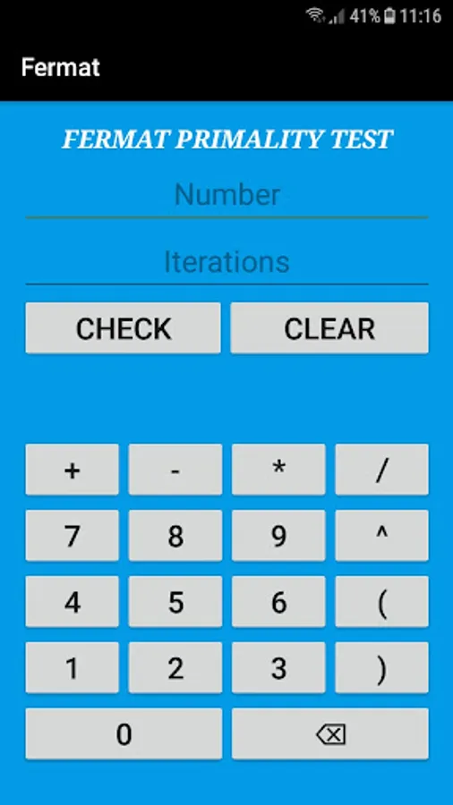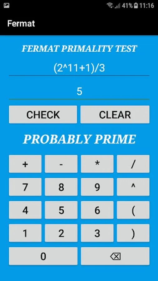 This app implements Fermat probabilistic primality test. It checks primality of 1000-digit numbers in no time. You can use arithmetic operators +,-,*,/,^ and parentheses to enter a number of a special form.