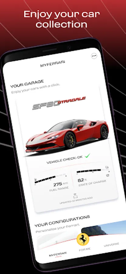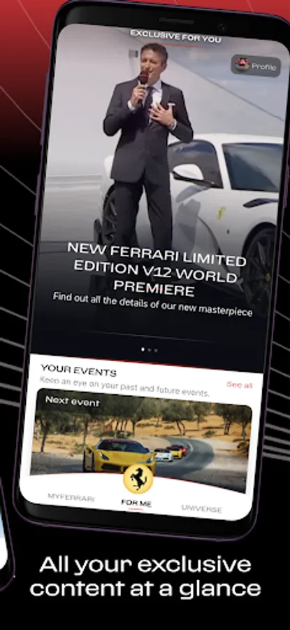 MyFerrari is the exclusive application designed for Clienti Ferrari: the key to staying connected with the legendary Prancing Horse universe, where you can browse exclusive content and access personalised services in a simple, intuitive way.