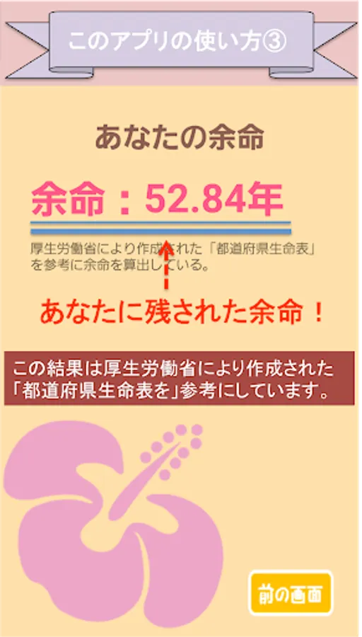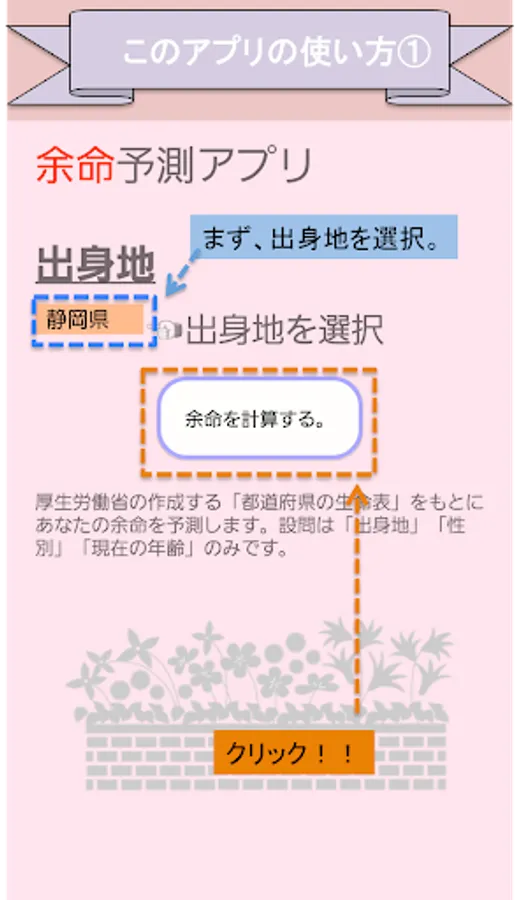 ①出身地、②性別、③年齢からあなたに残された余命を予測します。厚生労働省の「都道府県生命表」をもとに算出しています。