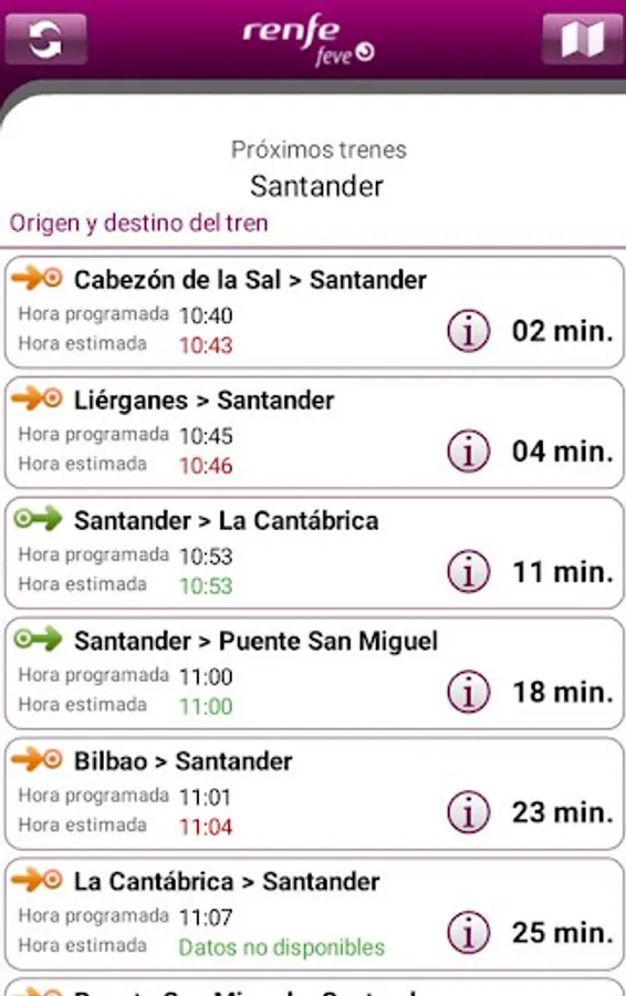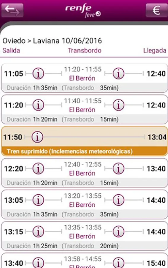 The results obtained are reported transfers to perform. For each train can get the data from all its stops selecting the information (i)
