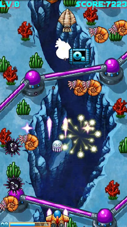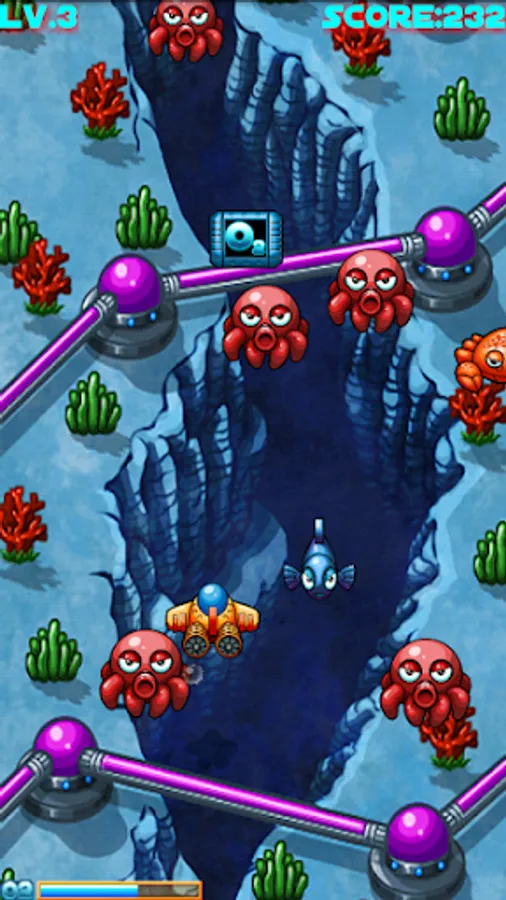 In a distant future, when it became impossible to live on earth, humanity built its high-tech metropolis on the ocean floor! But as in the surface, even under the sea wars broke out, and a group of mad scientists built a horde of marine robots to wipe out civilization and conquer the world. Now its your turn, begin to play and fight to clean up the ocean by the robot monsters! The mission is long and demanding, do not forget to supply your ship with oxygen!