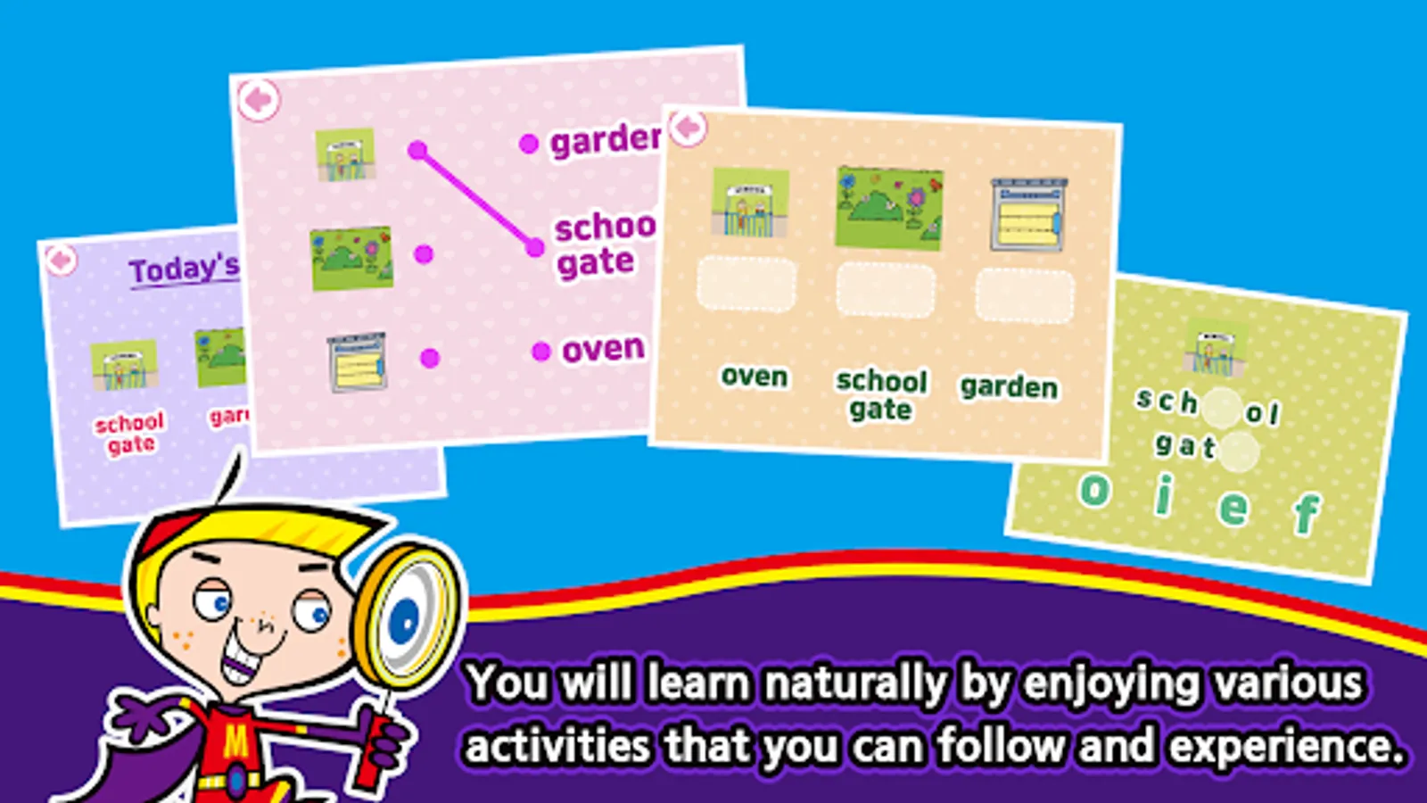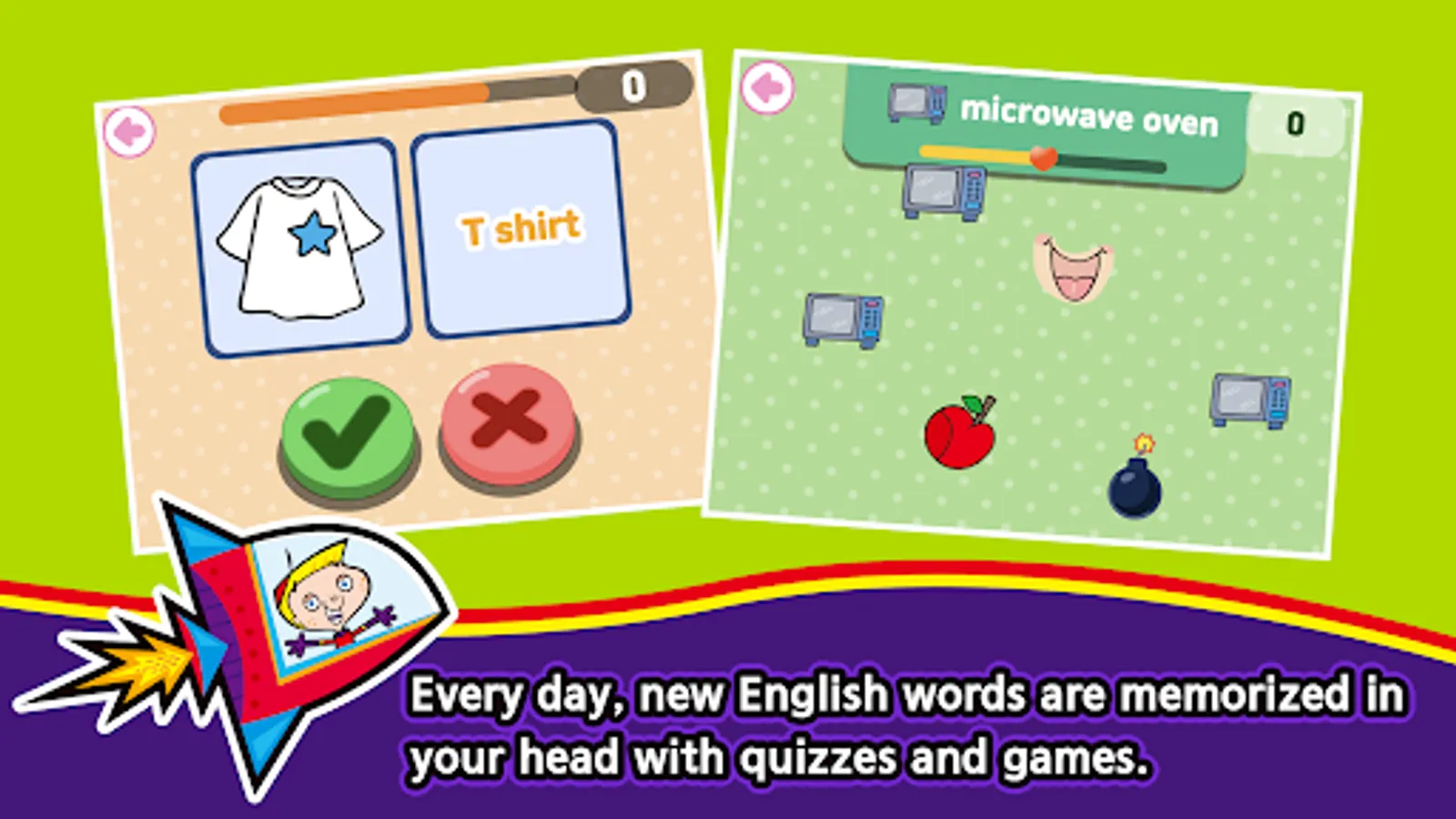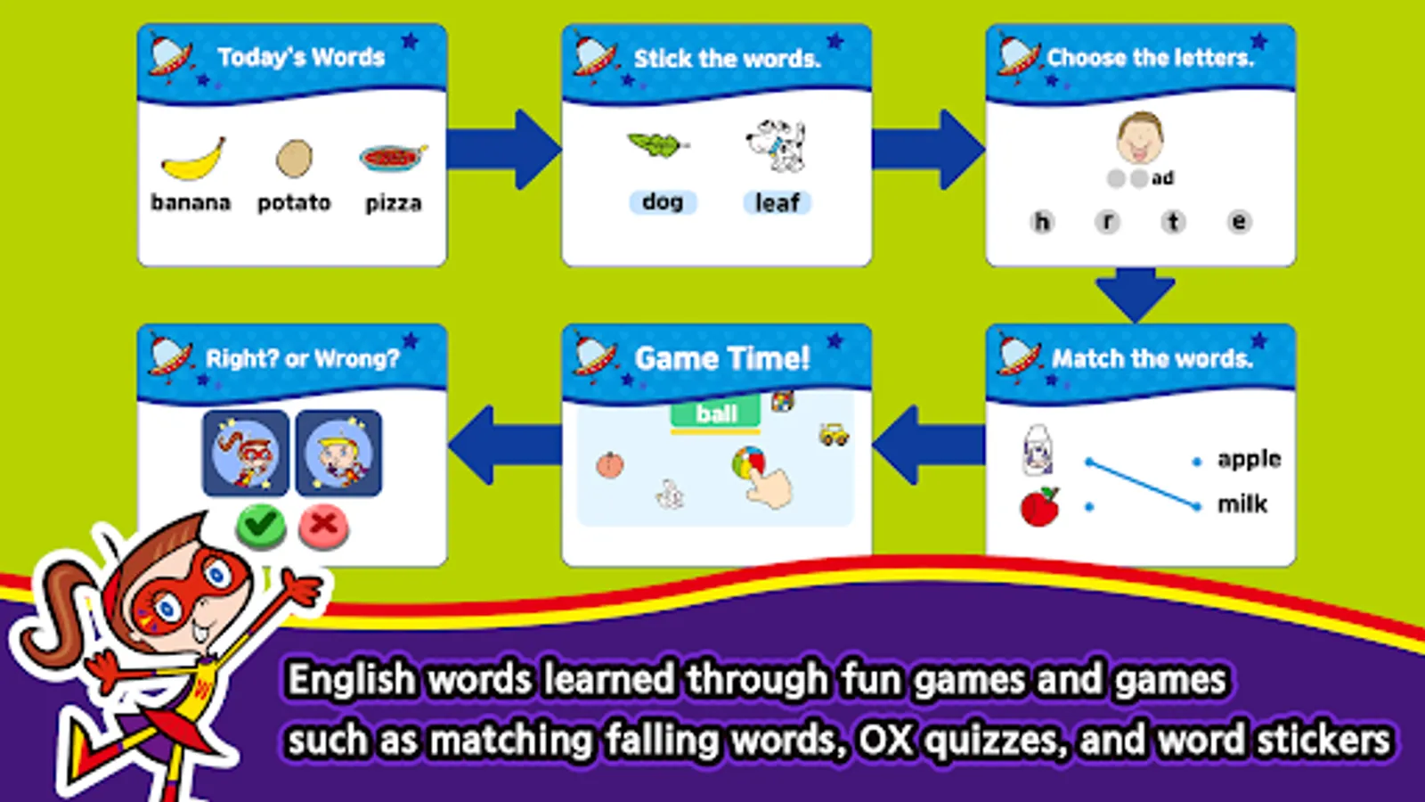 Today’s Words, Essential English words that our children can learn through fun play learning contents such as OX quiz, matching falling words, word stickers, and matching words