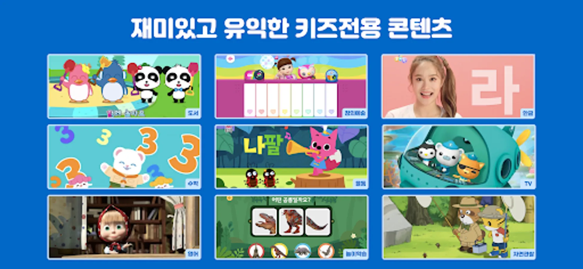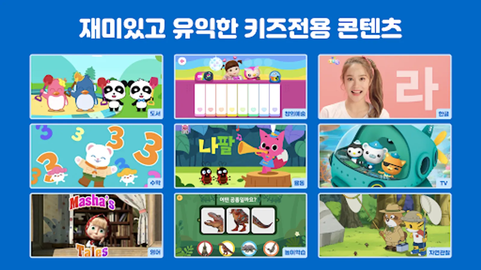 • Enjoy healthy content ranging from popular characters such as Kongsuni, Pororo, Octonauts, Super Wings, and Masha to various educational content such as Daekyo, Tnitney, and Applebee's.