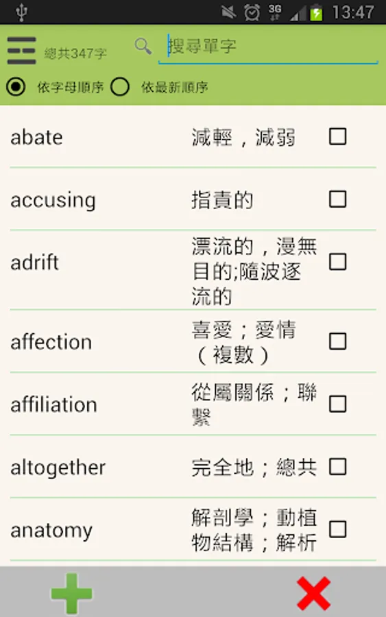 1. 單字簿:新增,刪除,查詢單字(可經由單字,中文翻譯,註釋等查詢相關詞彙)