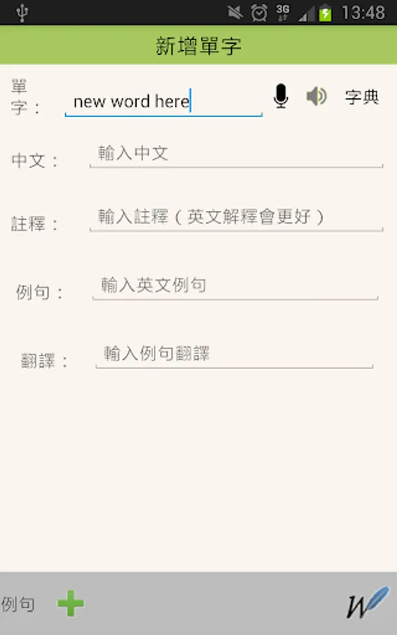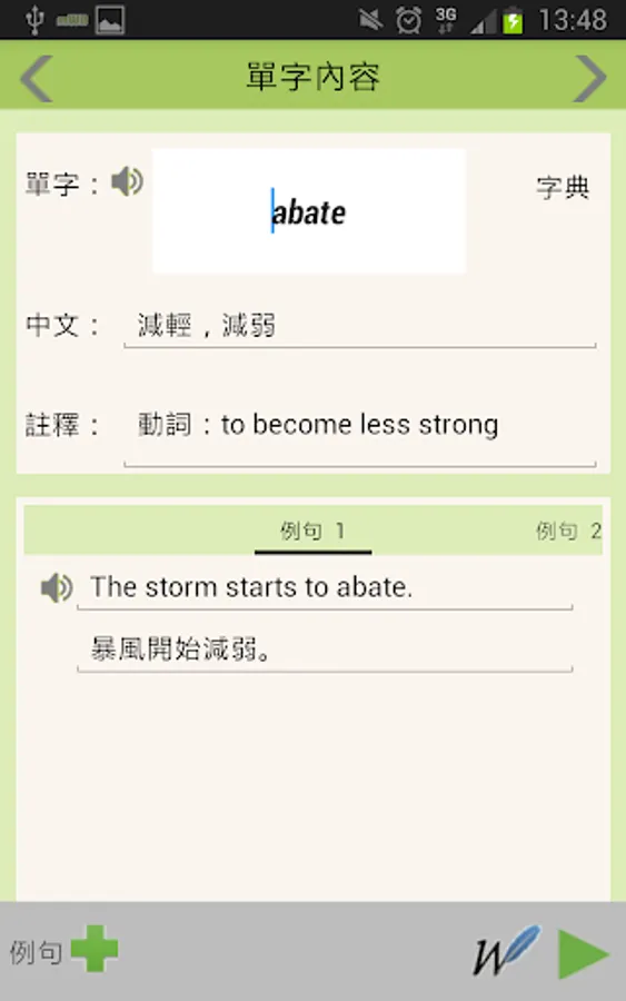 英文的學習,單字是基礎,但是還不夠,單字的活用才是關鍵;而結合自己的生活經驗更能創造高成效的學習成果。不論是閱讀雜誌,聽廣播,看影片,在路上遇到的廣告,遇到單字的時候,如果能夠有即時查詢和即時記錄的工具,那就太好了。這個APP提供你線上查詢中英字典和英英字典,讓你能夠用英語來理解單字,更深刻了解每個單字的應用情境。你也可用英文將自己的生活體驗寫成例句,連結每個單字和自己的生活。閒暇的時候,也許是等車的5分鐘,利用這個APP,複習一下,測驗一下;獨自一人的時候,戴著耳機讓這個APP為你朗讀每一個單字和例句;你的記憶將會不斷鮮活地出現在面前。擔心自己苦心經營的單字簿因為手機故障而遺失嗎?不用擔心,只要有Google帳號,你的資料都可以經由Google雲端硬碟進行備份與復原。這個APP將會是你學習英文的最佳夥伴,它也會幫你成就一本專屬於自己的有聲單字簿,造就你的英文能力。