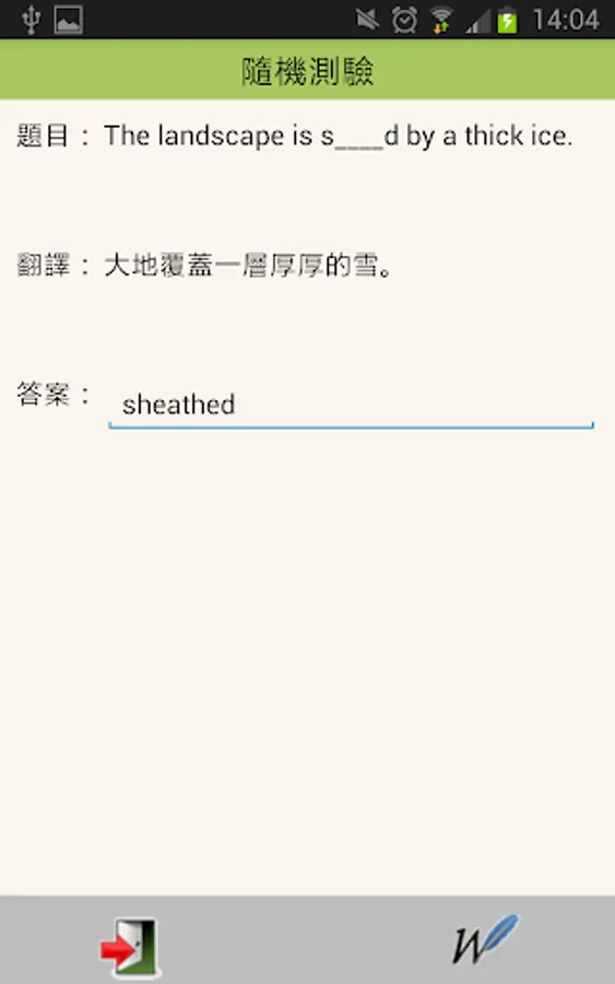 4. 隨機測驗:依據使用者鍵入的單字與例句,隨機產生填充題進行自我測驗