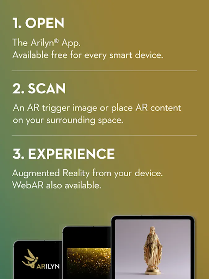 In addition to AR experiences the Arilyn app features also examples and fun demos. The app is free for everyone to experience augmented reality created with Arilyn.