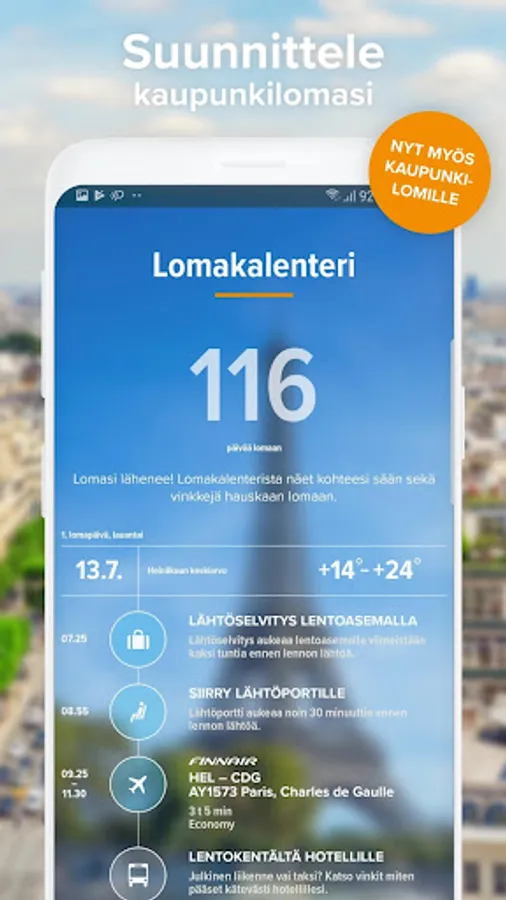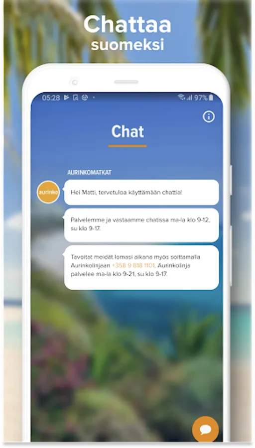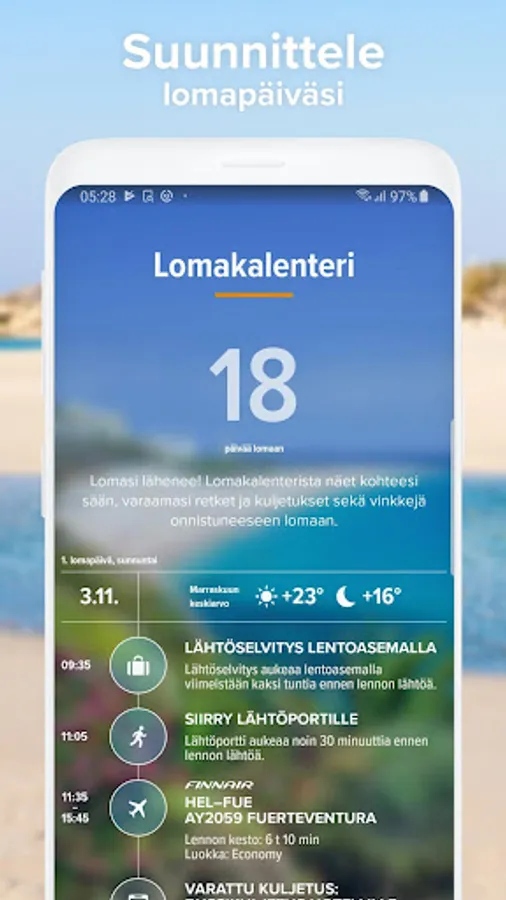 The Aurinkomatkat app acts as a travel partner at all stages of your holiday! Download the app as soon as your holiday is booked and you will have access to the following services: