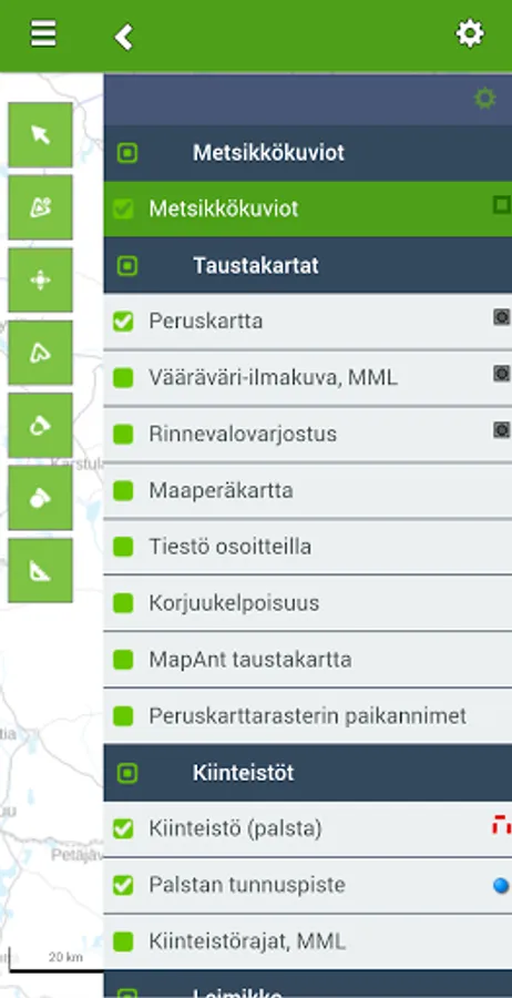 Foresta Terrain has scalable map data (e.g., harvestability, stand length model, forest resource data collected by remote sensing) and easy-to-use mobile tools that support field visits, forest and stand planning, and on-site status assessments. You can also download the material to your device for offline work.
