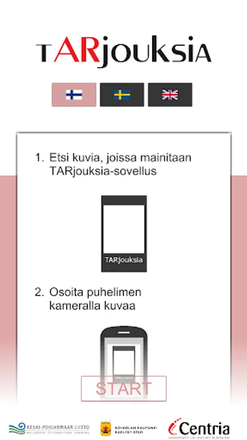 Point your phone's camera towards the tag pictures, which mention TARjouksia-application. Once the picture is recognized, the application will display product offers in augmented reality.