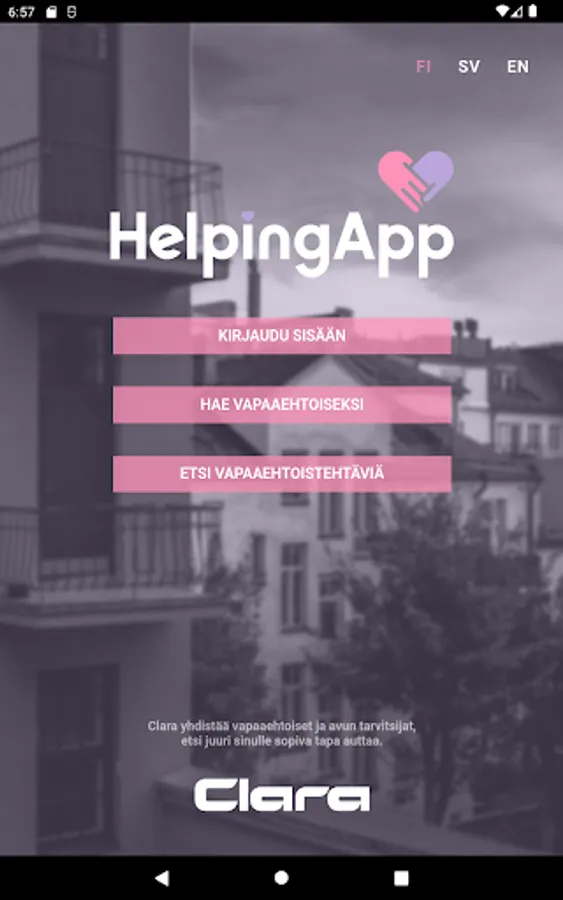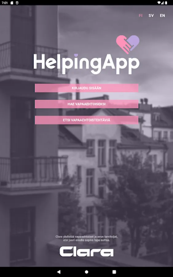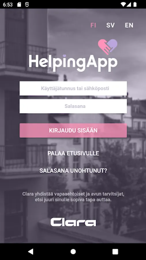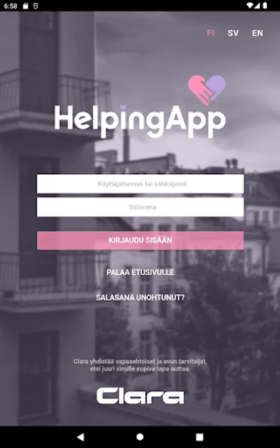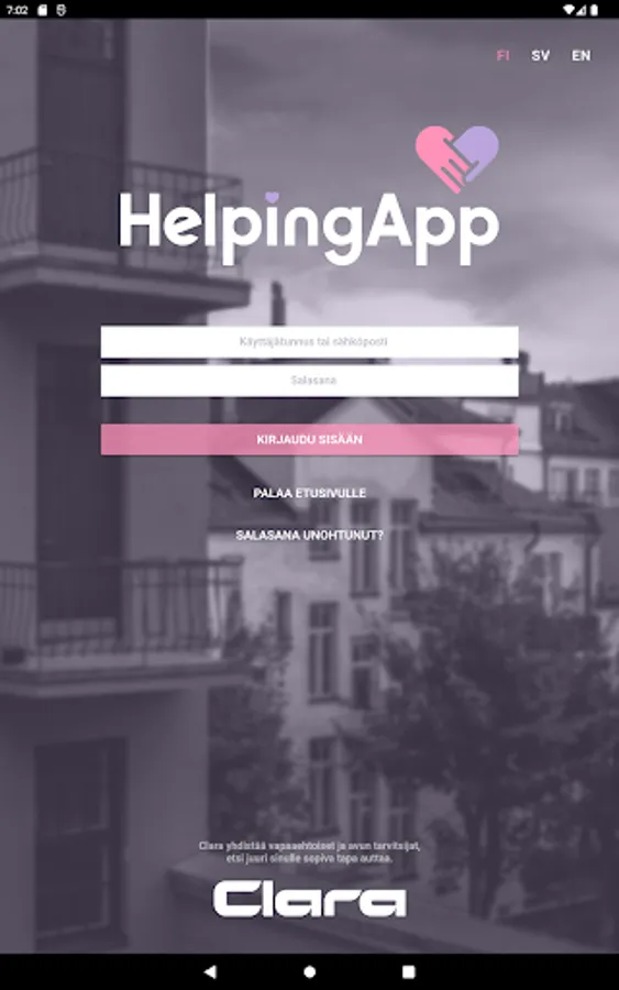 The login requires credentials, which the volunteer can get from the volunteering organization. The organization needs to have an agreement with Clara Finland Oy for the Clara service.