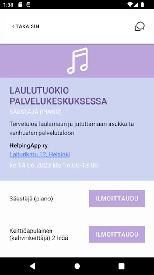 The app includes also a chat, where volunteers can discuss privately with the coordinators. Alternatively a volunteer can start a group chat, where all volunteers can participate and ask or comment about the details of a certain task.