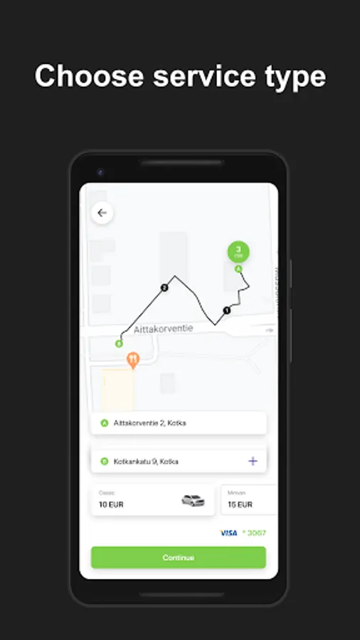 - Fast service. Due to unique algorithm that designates the nearest cab driver to pick you up anywhere in Kotka, so you don't have to wait for a very long time for your car