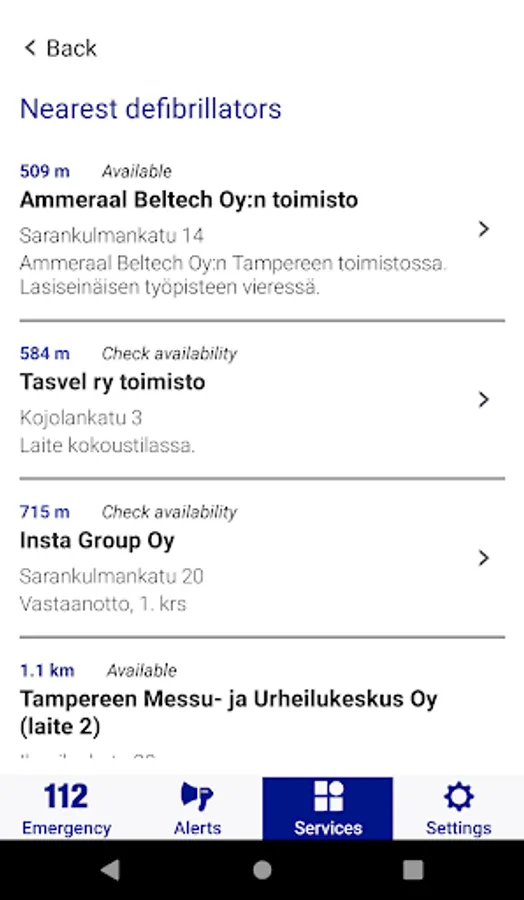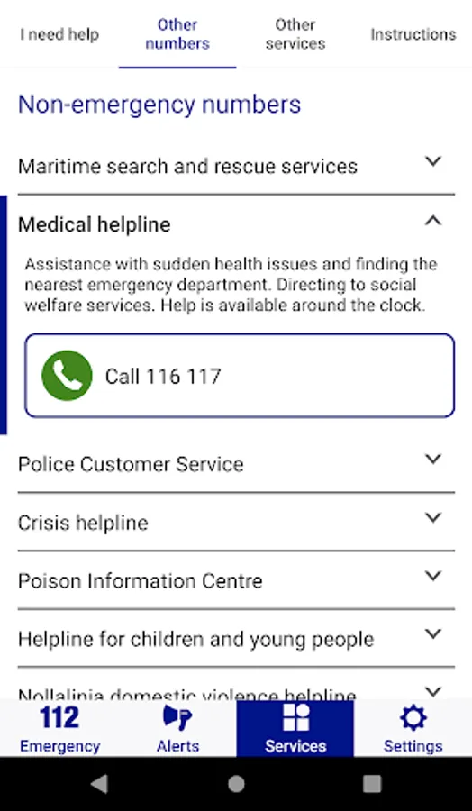 The app includes hotlines for non-urgent situations. It also allows you to check the location of the nearest defibrillator and make a travel registration informing the Ministry of Foreign Affairs that you are travelling abroad.