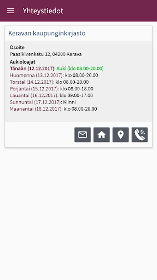 The library is a mobile service Kerava City Library customers. The application allows you to check and new loans, make reservations, borrow books directly from a friend, add interesting material in the favorite list, check the library's opening hours and contact information and send feedback. You can also use the application as a library card.