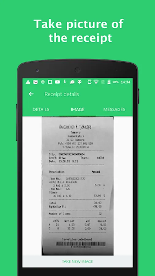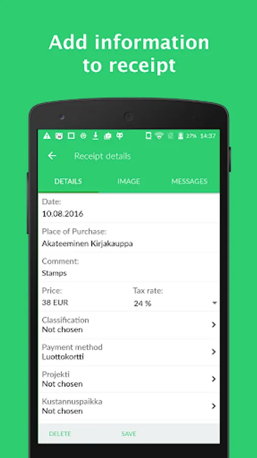 Saving receipts is done by using your phone's camera. You can add information to the captured image to make both your and your accountant's work easier.