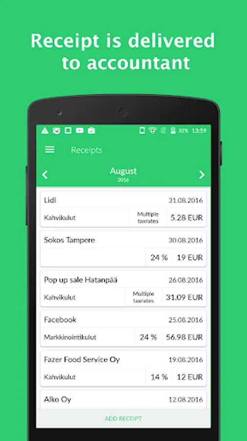 The application allows you to save your data to the eTasku cloud. In the cloud service your receipts are in a safe place and available for your accountant.