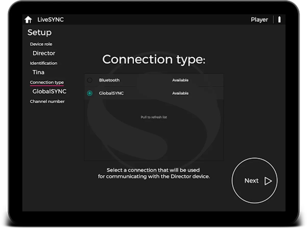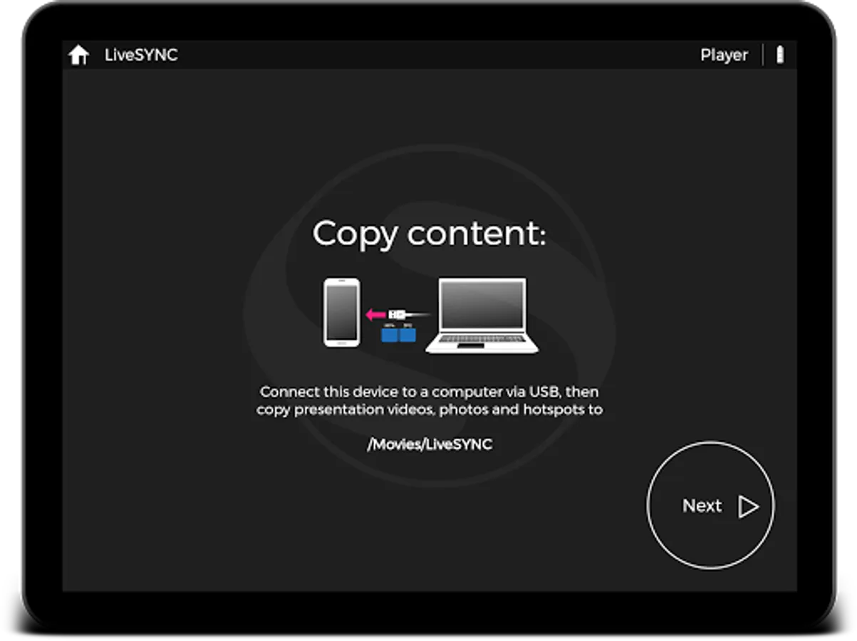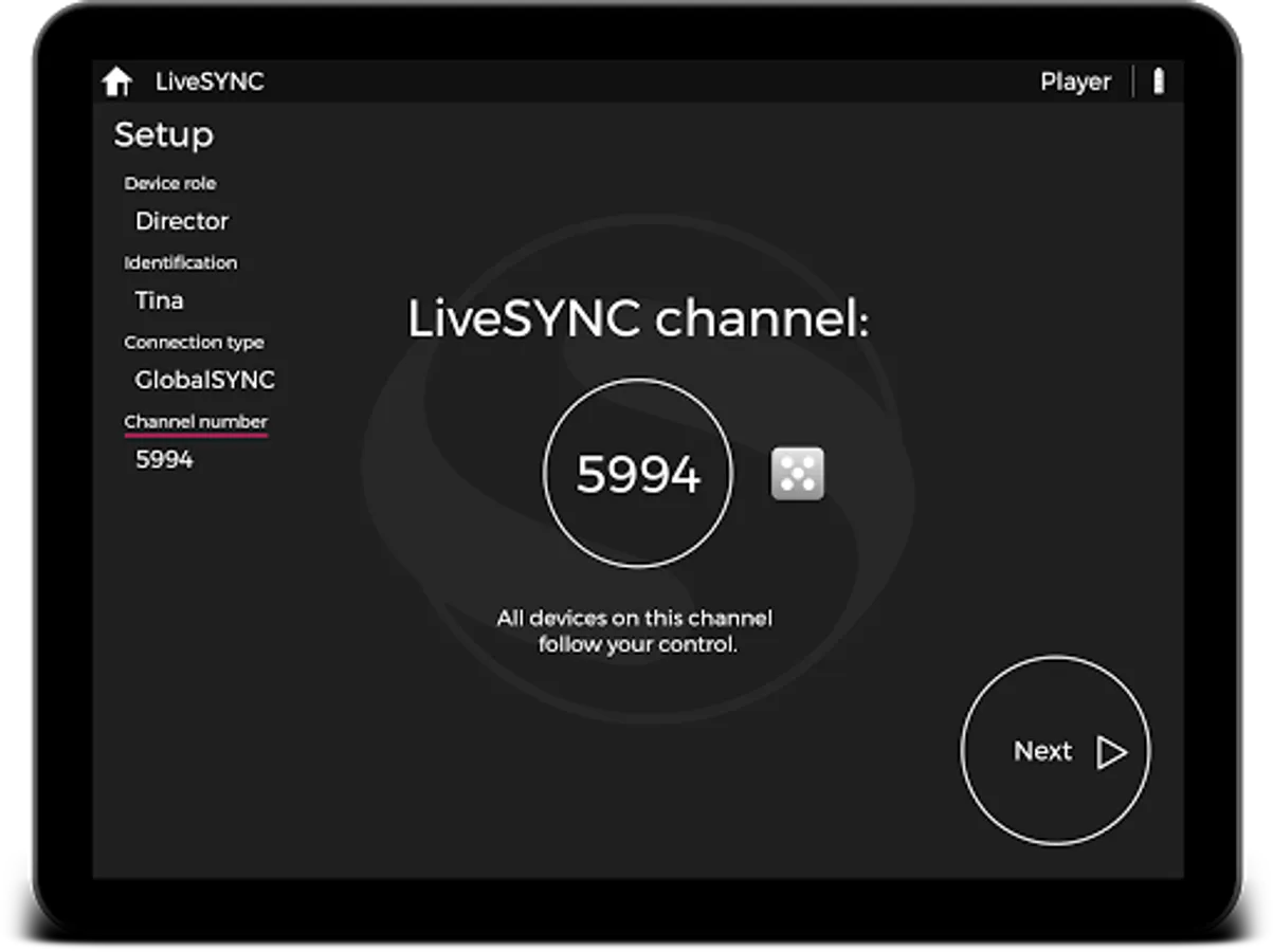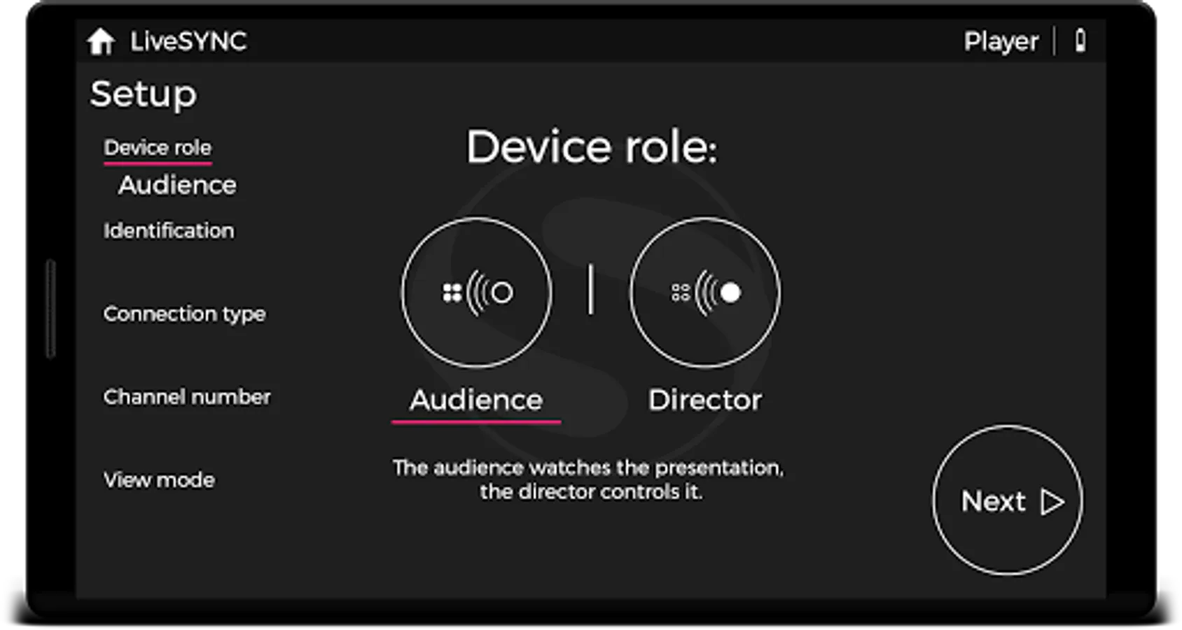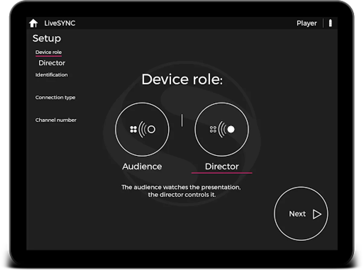 LiveSYNC is really easy to use: in the setup wizard, you decide whether a device acts as the director or belongs to the audience, give a distinctive name for the device so that you can identify them, and reserve a communication method and channel for your presentation. After copying your media files in place you are ready to go.