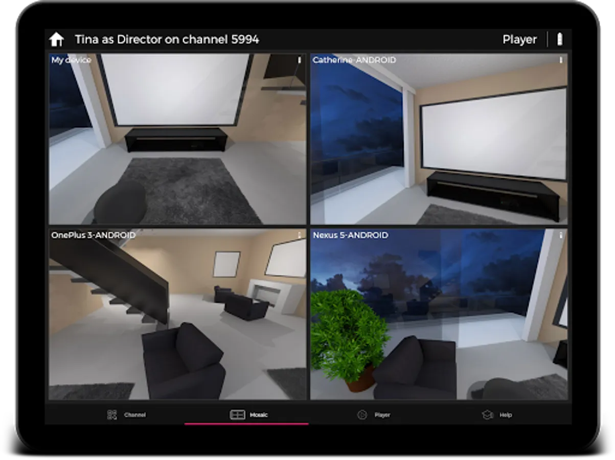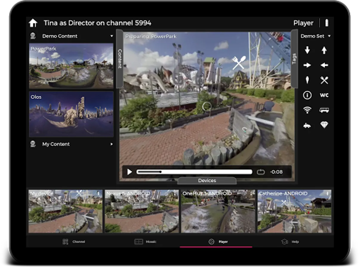 In the director mode, you will instantly see when a client device joins your channel. During your presentation, you can change the content at any time simply by dragging your 360 photos and videos from the media library to the presentation view. The client devices report to master when they have prepared the video and the whole group begins to watch it in sync.