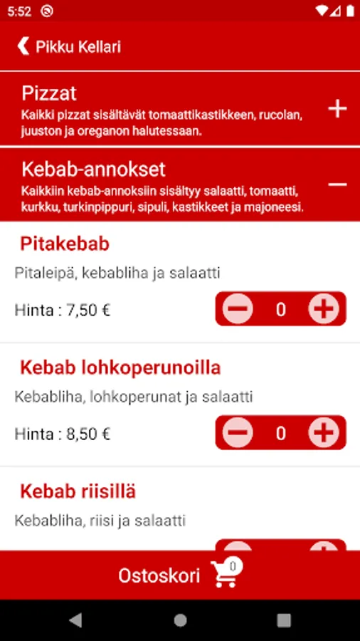 Order pizzas and Kebab portions as pickup or home delivery. Our offer includes Pizzas, Kebab Servings, Chicken Fillets, Vöner, Vegan Pizzas, Hot Wings, Snacks, Chicken Doner, Falafel, Salads and Beverages.