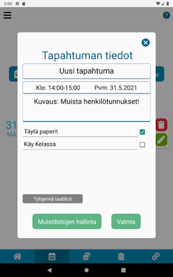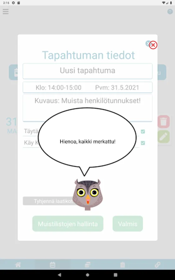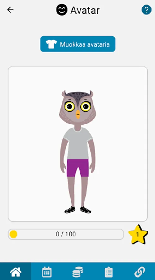 The calendar has a Finnish-language user interface with many different color and sound options to choose from. The gameplay is enhanced by fun avatar characters that the user can add and edit to their own profile and thus become more and more motivated to use the app.