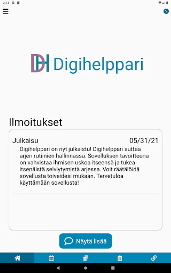 The user is in full control of his / her assistant, but he / she can, if he / she wishes, give the housing service worker or one of his / her relatives the right to make entries in it. The aim is to increase the freedom of choice of the person in need of support in arranging support and to strengthen independent coping. The main goal of the application is to increase the young person's self-confidence and independent survival through the feedback of success. At the same time, the young person's dependence on another person's help is reduced. A path can be drawn from the goals, moving from one level to another.