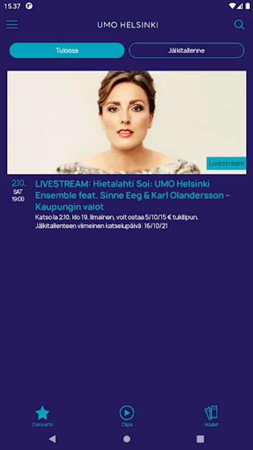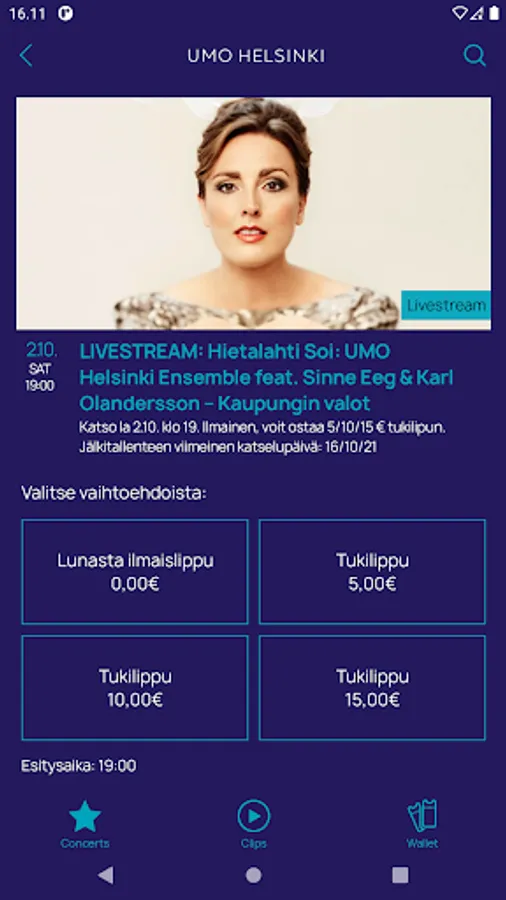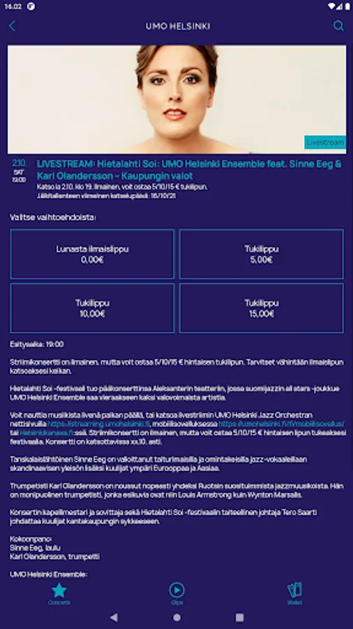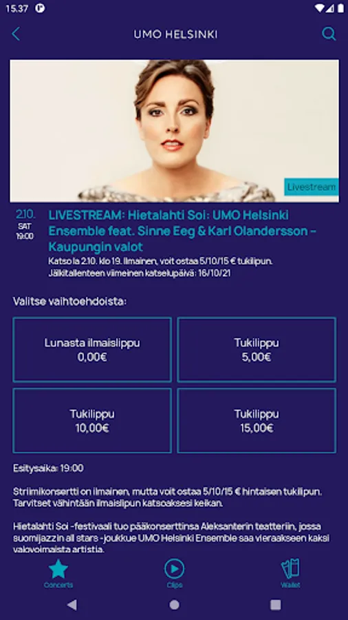 Downloading and using the application is free. Some of the online concerts will be chargeable, some of them free. The tickets to chargeable concerts can of course be bought via the app.