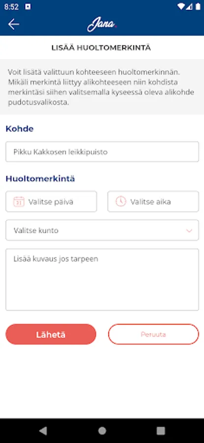 With the Jana Maintenance application, users can create and edit maintenance entries for the items they manage. The application works with the user ID of the Jana service.