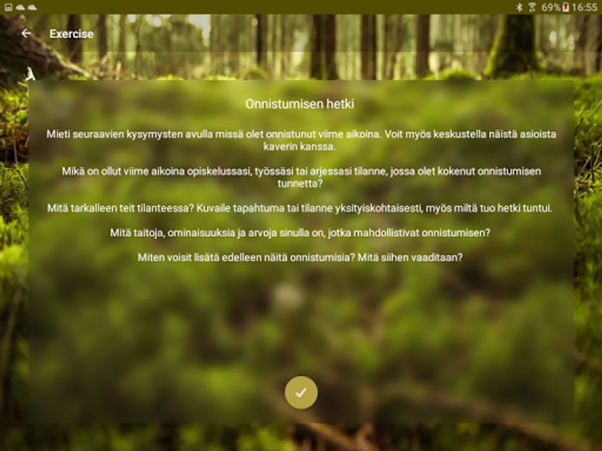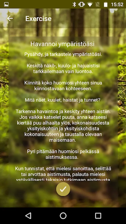 Calmfulness is an application for improving your well-being. The app takes you out to natural routes, along which the user gets a changing selection of refreshing Mindfulness exercises. Calmfulness uses Bluetooth to detect beacons hung along the route, and after finding a beacon provides you with an uplifting and energizing Mindfulness exercise.