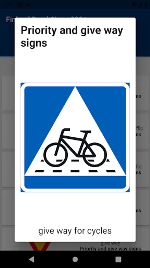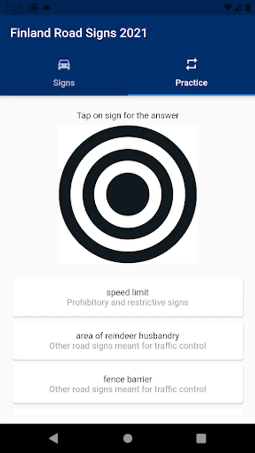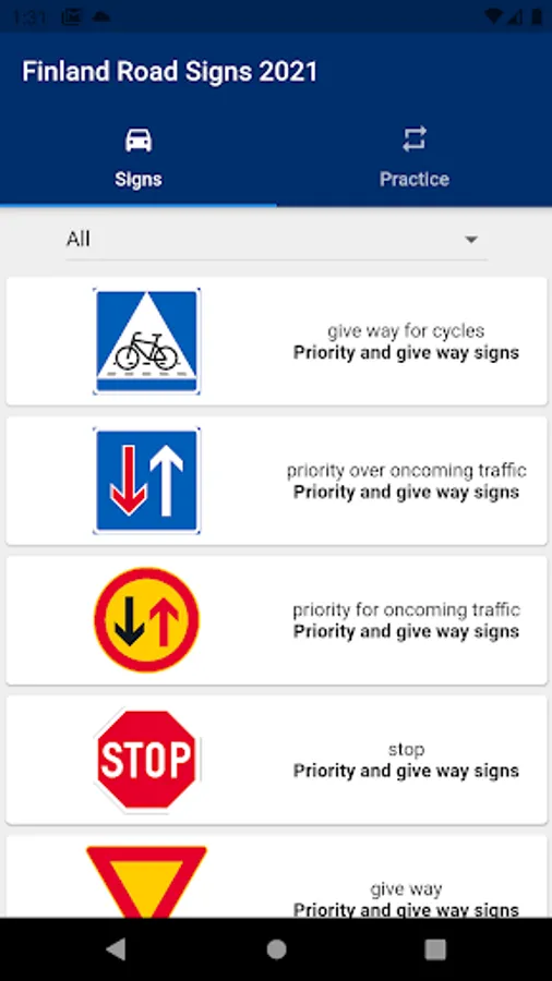 This application contains road signs that can be seen in Finland. Knowledge of traffic signs is mandatory for passing Finnish Driving license. There are different categories of road signs that can be found in this application and under the following categories.