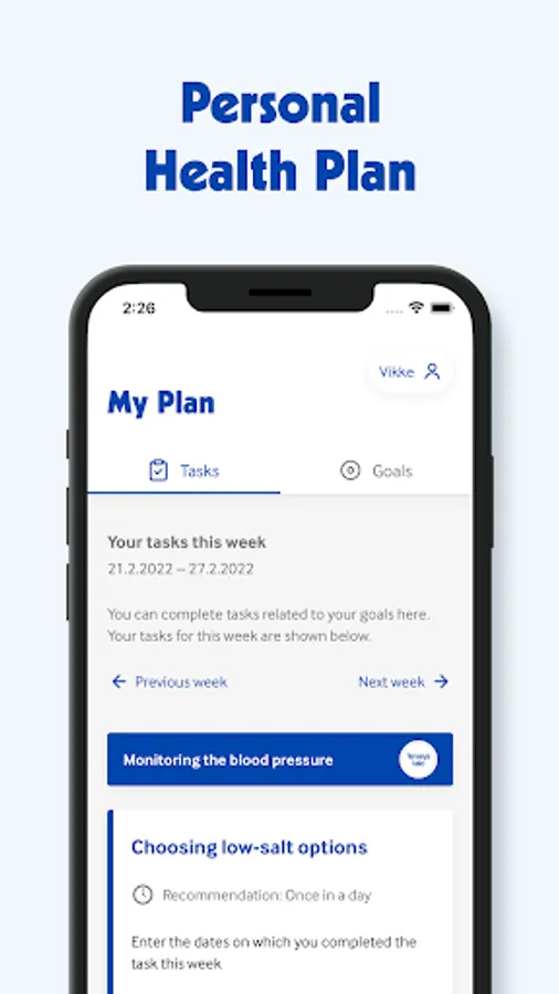 The personal plan includes goals that support your health. It is easy to record your own measurement results and self-evaluations in the plan. It also includes your personal physiotherapy programs with videos.